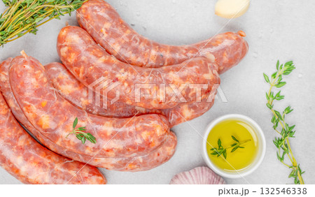 Raw pork sausages with spices, garlic, thyme, and olive oil on light background. Fresh homemade sausage, uncooked meat, organic food ingredient for barbecue and grill