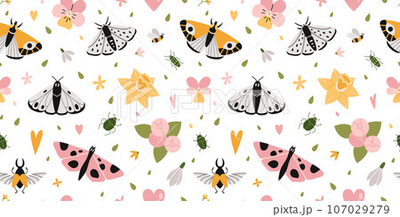 Seamless pattern with natural, plant elements, cartoon style. Flower, butterflys and bugs. Trendy modern vector illustration on white background, hand drawn, flat design
