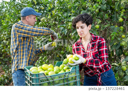 Skilled male and female picking lemons in orchard or on farm in autumn