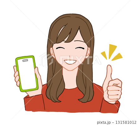 スマホを持って親指を立てている若い女性 手描きイラスト素材