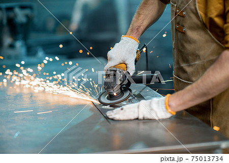 研磨作業で火花を散らすグラインダーと作業員の手元