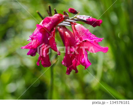Purple gladiolus flowers with water droplets on deep green