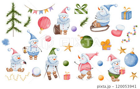 Snowmen, Christmas tree, gifts, balls. Hand drawn Christmas watercolor set. Illustrations with colored holiday elements on a white background. Isolated. For designs, cards, banners and more.