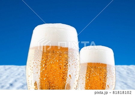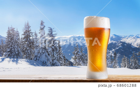 Poster with glass of light cold foamy beer over snow-capped mountains background. Holidays, vacation, drinks, taste, ad and oktoberfest concept