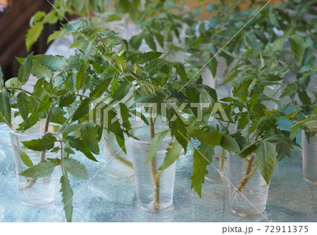 Agricultural background.When the tomato seedlings outgrow, the sprout is cut off and put in water to take root.Plants are ready to be planted in the open ground.
