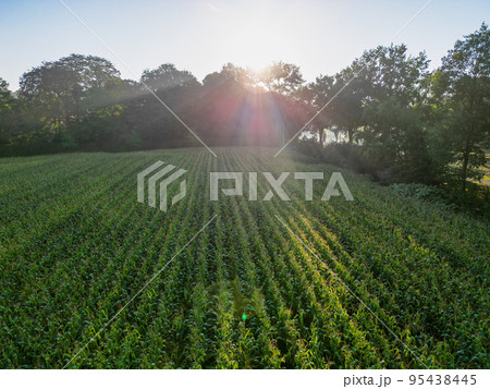 Quiet golden sunset over the green rural cornfields, countryside fresh agricultural background