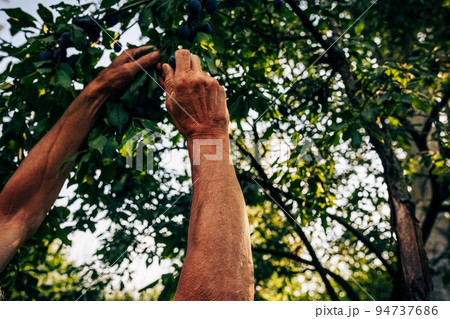 Senior male hand picking plum from tree in orchard. Farmer harvesting in country garden. Natural eco food cultivation and harvesting. Horticulture and greenhouse concept