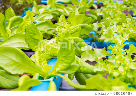 Hydroponic lettuce growing in garden hydroponic farm lettuce salad organic for health food, Greenhouse vegetable on water pipe with green oak and red oak.