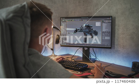 Caucasian teenager creates 3D model of sniper rifle using computer