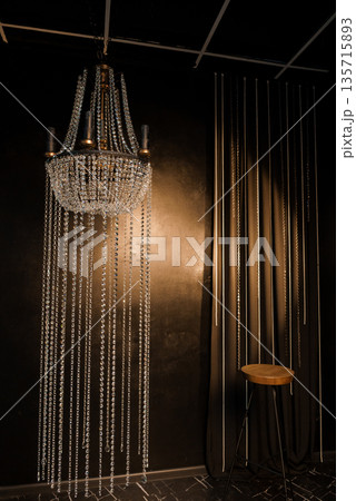 Elegant Crystal Chandelier Hanging With Beaded Drapes in Dark Luxurious Interior Setting