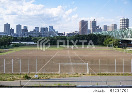 夏の雨上りの整地された江戸川河川敷の野球場風景