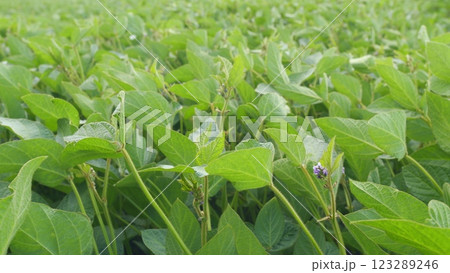 Green ripening soybean field, agricultural landscape.
