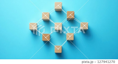 Wooden Cubes Connect with White String on Blue Background, Network Concept