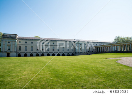石柱の並ぶ大きい通路のついた歴史的な白壁の石造りの建物 ロンドングリニッチパークにて