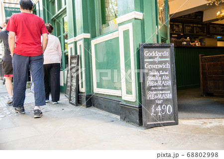 グリニッチの街並み パブの前に置かれたメニューの看板と道行く人々