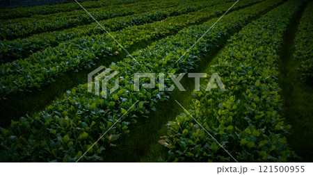 Cabbage field with close rows of leafy green vegetable plants