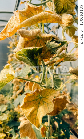 Yellowing leaves of a climbing plant in a greenhouse showcasing natural decay and growth