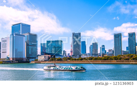日本の東京都市景観 新風景。水上バス・ヒミコや竜馬、橘丸、竹芝、浜松町…。奥に東京タワーや麻布台