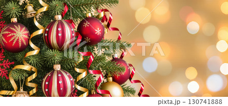 Christmas tree decorated with red and gold baubles, ribbons, glitter ornaments and bells against glowing festive lights background creating holiday sparkle.