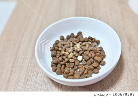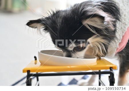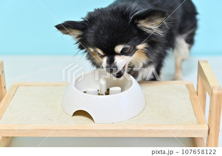 ドッグフードとサプリ 美味しそうに食べるチワワ