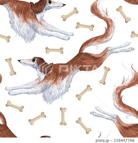 A watercolor seamless pattern featuring a greyhound and bones