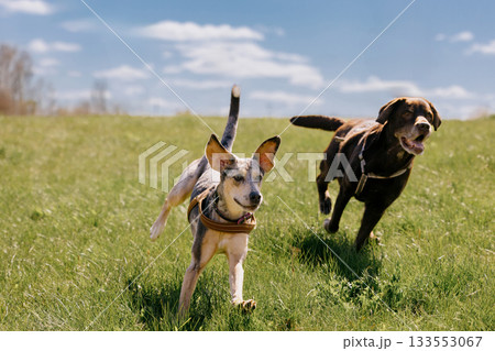 Two happy dogs are running across field against blue sky. spotted greyhound and Labrador retriever.
