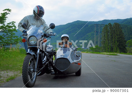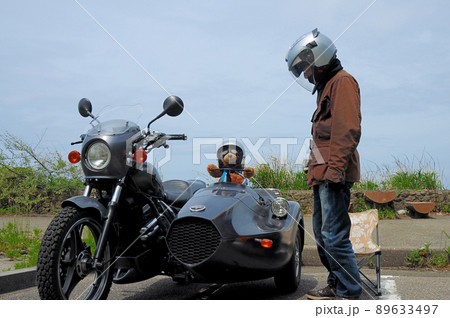 海辺のパーキングで熊の縫いぐるみを乗せサイドカーの記念撮影