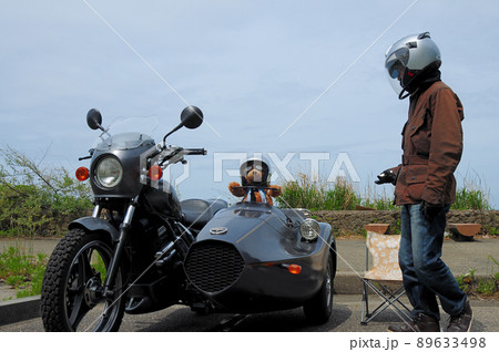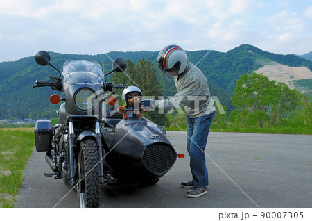 海辺のパーキングでサイドカーの点検をするドライバー