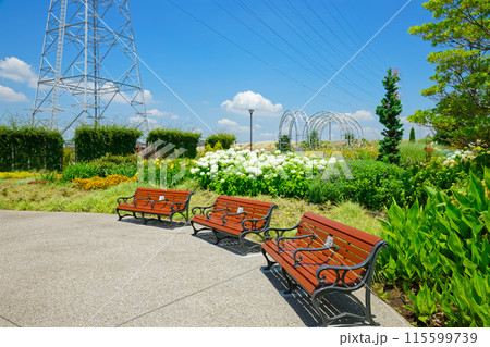宮前公園のベンチとアナベル アジサイ ガーデン