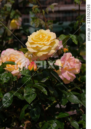 クリームイエローにピンクがのった覆輪のバラの花・ピースに沢山の水滴
