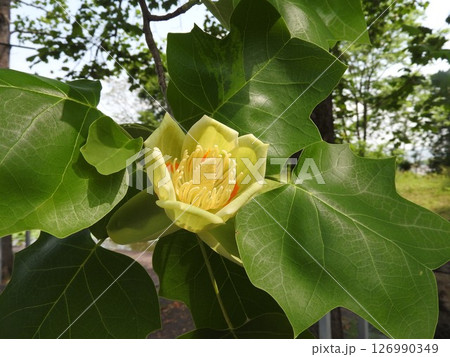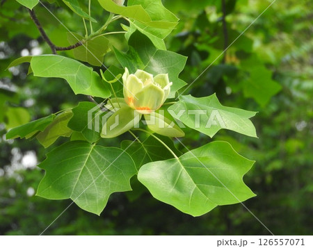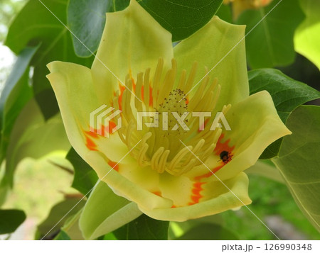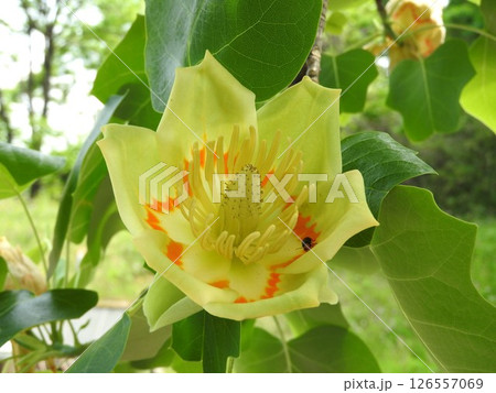 タマボケを背景に花芯が見えるユリノキの花/モクレン科