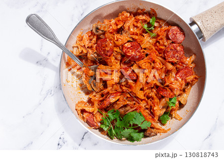 Bigos, Polish dish bigos, on a marble table, stewed meat with cabbage, chorizo sausages, mushrooms, homemade, without people,