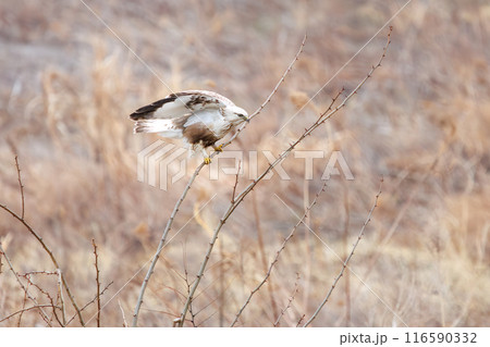 枝に飛びつく美しいケアシノスリ(タカ科)。 日本国群馬県、利根川河川敷にて。 2024年2月撮影。