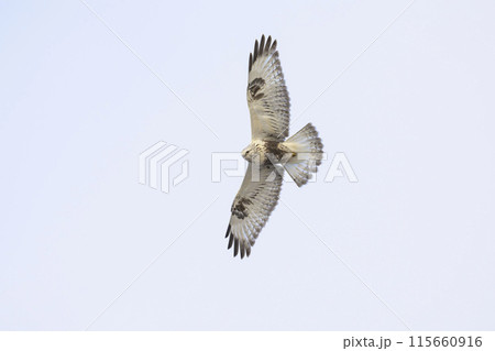 飛翔する美しいケアシノスリ(タカ科)。 日本国群馬県、利根川河川敷にて。