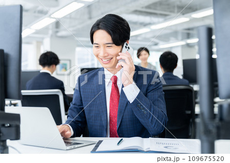 スマホで電話する半袖シャツを着た若いビジネスマン