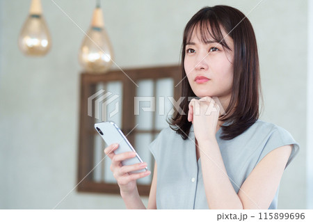 スマホでメールを読みながら唇を噛んでいる神経質な女性。表情には不安が漂っている。