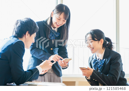 教室でクラスメイトとスマホを見ながら話す男女高校生