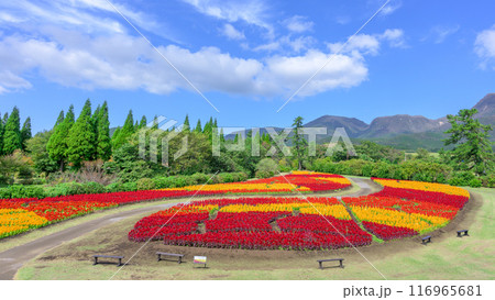 くじゅう連山を背景に美しい秋の花風景 セロシア・ケイトウの花 風景「くじゅう花公園」大分県竹田市