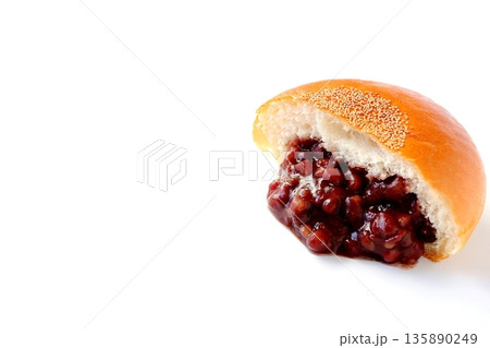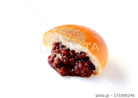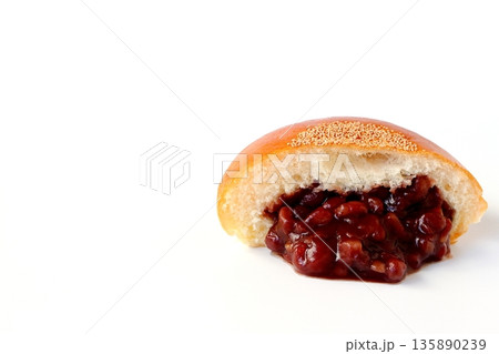 白背景のあんこが溢れているあんぱんの断面