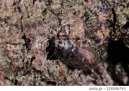 生き物 昆虫 キボシコオニケシキスイ、やや平たい楕円形の体。樹皮の隙間や窪みに隠れやすい形