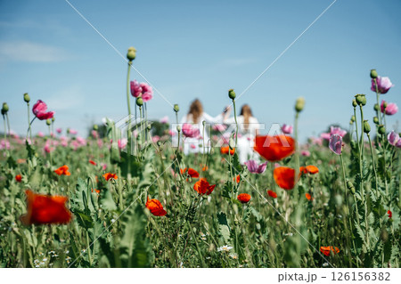 Two girls in white dresses embrace from behind, standing in a field of pink poppies gently swaying in the wind. A high-quality photo capturing the warmth and serenity of the moment amidst the vibrant