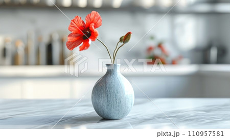 a minimalistic vase with one red flower stands on a white marble table