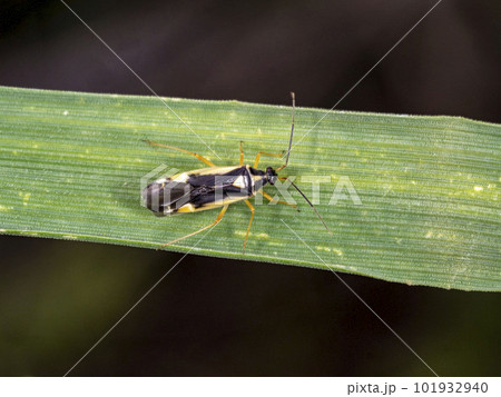 生き物 昆虫 ケブカキベリナガカスミカメ、毛深い体に黄色い模様が目立つ。脚も口吻も薄黄色