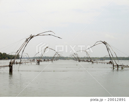 インド ケララのバックウォーターのチャイニーズフィッシングネット