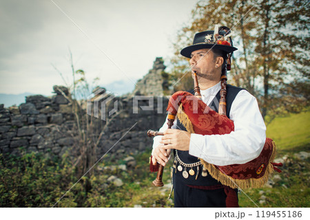 Traditional Scottish Bagpipes, Kilt, Scarf, and Sporran Illustration