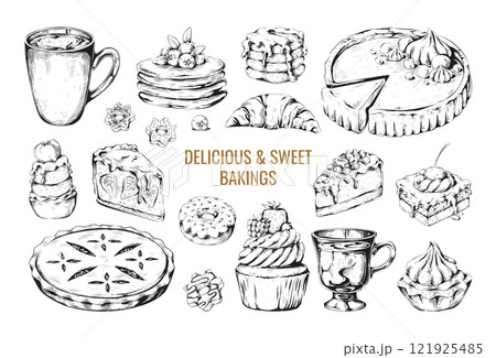 Hand drawn cake. Bakery dessert sketch. Handmade pastry like tart, cream pie or cheesecake. Coffee cup. Pancakes with topping. Engraving delicious muffins. Vector baking confectioneries set
