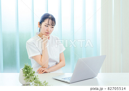 パソコンを使う白衣姿の女性(困る)