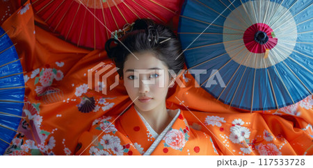 A young beautiful geisha in a kimono. Portrait of a pretty asian woman. Fashionable cute woman. Generative AI