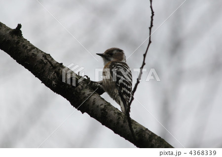 木の枝に逆さまにつかまり木を突く冬の北海道のアカゲラ