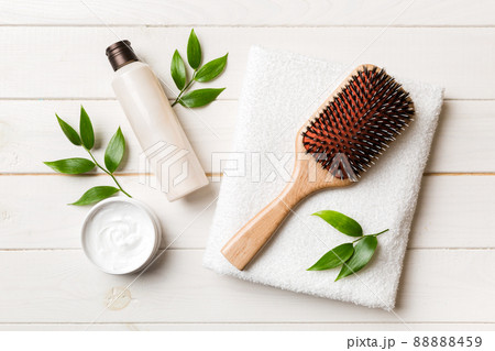 cosmetic for hair care, cream and towel on a colored background top view. flat lay
